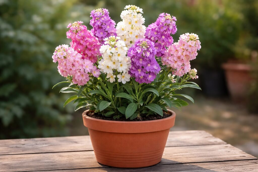Alhelí: Una opción que aporta belleza y aroma únicos. Se adapta bien a épocas de sequía, pero no tolera el exceso de agua. Se recomienda el sustrato universal o para plantas de exterior, con un pH ácido entre 5,6 y 6,2. Para que crezca sana debe mantenerse entre los 5 °C como mínimo por la noche y 25 °C como máximo durante el día. Es importante ubicarla donde pueda recibir la luz del sol.