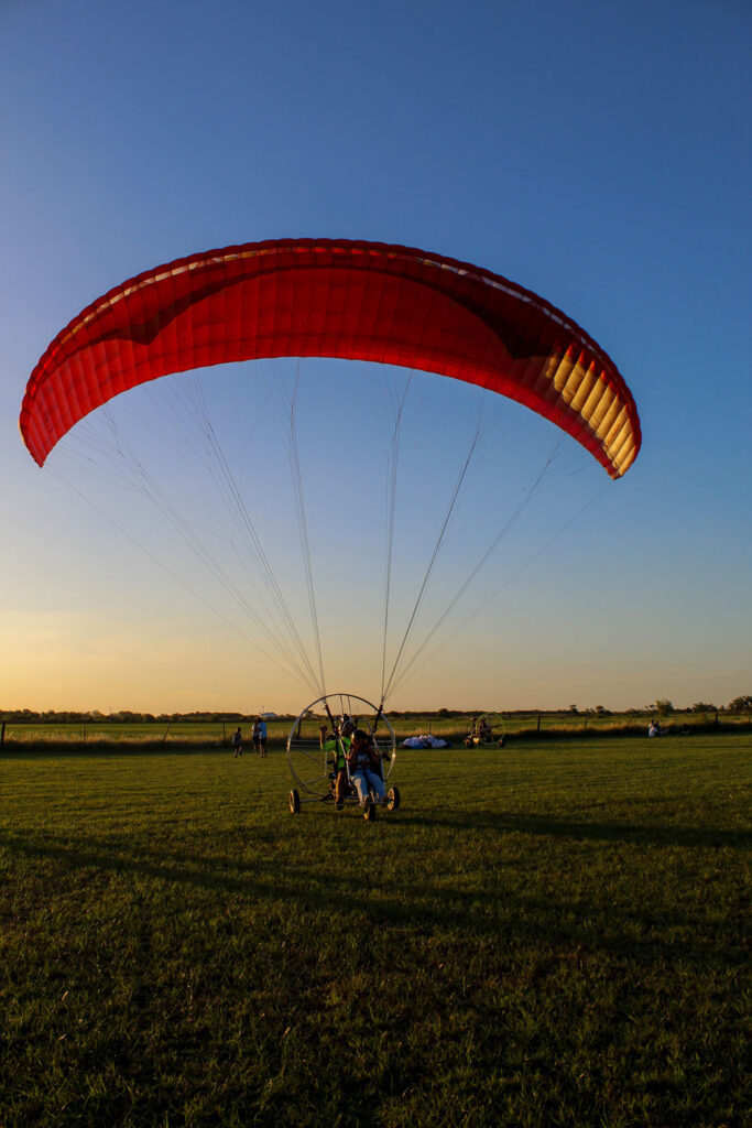 Juan rinde su licencia todos los años, en materia práctica y teórica, y cada dos años realiza el curso SIP de emergencia en vuelo sobre el agua y su resolución. Su equipo está supervisado con seguros de transporte y responsabilidad civil en regla, un detalle que no hay que soslayar a la hora de iniciarse en esta aventura. Los equipos utilizados son de vuelo comercial, aeronáuticos y nuevos, con paracaídas de reserva, aprobados por la Federación Argentina de Vuelo. “Es un vuelo super seguro. El motor se usa nada más que para subir, y luego manejamos las corrientes. Pero si se requiriera, lo volvemos a usar y aterrizamos donde queremos”, explica. El vuelo está permitido para niños desde los 6 años (con autorización de los padres), y adultos hasta 100 kilos. El club, asimismo, es el único para vuelo en la ciudad, y cuenta con una movida interesante cada fin de semana. “Hemos parquizado y logrado mucha sobra, y de a poco se van sumando servicios”, cuentan sus responsables. Con varias reseñas en Google My Business y una destacada calificación promedio de 5, el lugar garantiza vistas panorámicas y una estrecha conexión con los elementos naturales que rodean la ciudad. “Nunca tuve una queja. La gente queda copadísima, aunque el turista promedio suele venir una vez: hace la experiencia y listo. Son vuelos de iniciación, como para sacarse el gusto de volar una vez. A quienes sí he llevado muchas veces es a profesionales que necesitan fotografiar el río o los campos, o hacer trabajos que registren la geografía en tiempo real”.